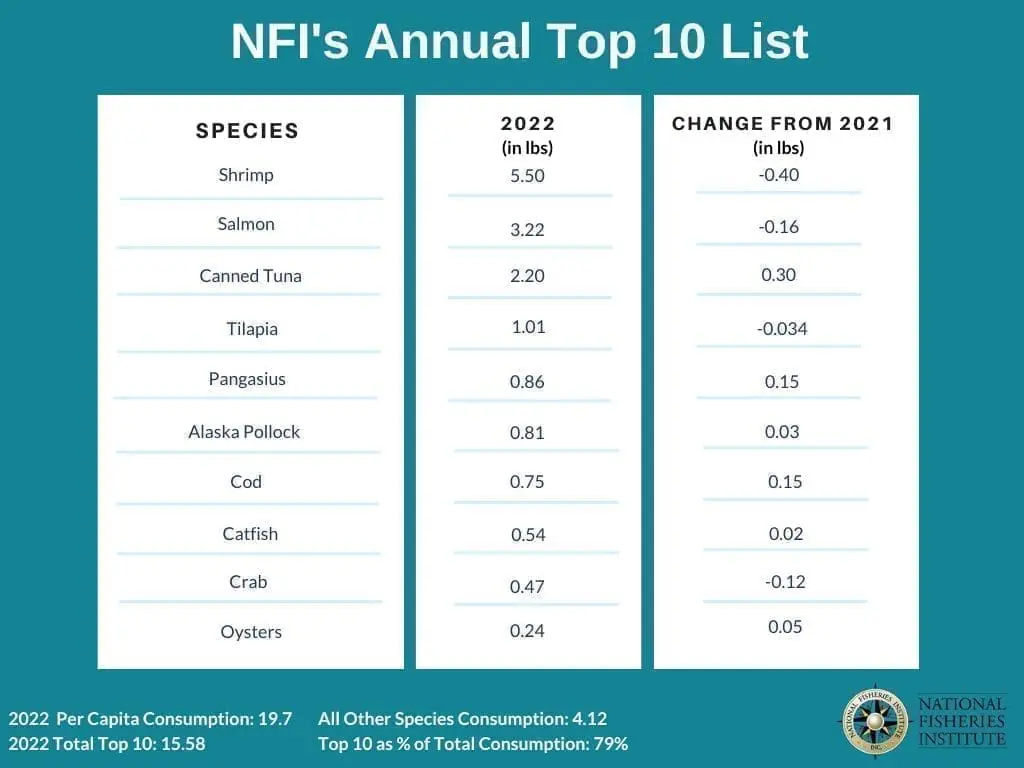 “The 2022 Top 10 List reflects the correction that took place following the 2021 supply surge which saw a 9% increase in available seafood,” NFI Programs Director, Richard Barry, said. “Since the previous year experienced record high supply growth, a slight dip the following year was expected. The 2022 per capita number; however, remains higher than pre-pandemic consumption, an encouraging sign of retained seafood consumers.”