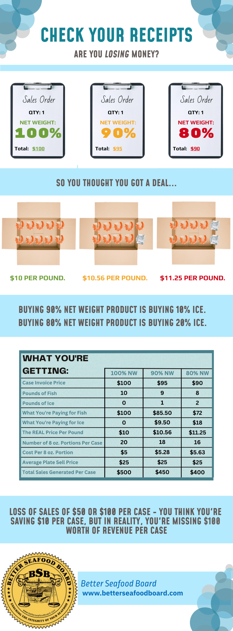 An infographic by the Better Seafood Board urging buyers to check their receipts to see how much of the net weight of their product is ice. Click the link to download the image.